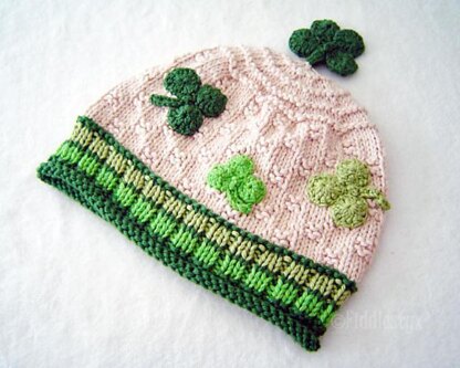 Knit in the round in a simple textured stitch, the shamrocks are crocheted and then sewn on. A lucky 4-leaf clover perches on top.