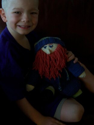 Knit in the round and almost completely in one piece, you'll start at the black shoes and knit on up, shaping his belly and heading toward his head. The arms and ears are knit separately and attached securely. The red beard and bit of hair on the back of his head looks best once the stands of yarn start to untwist ... creating a very natural look.