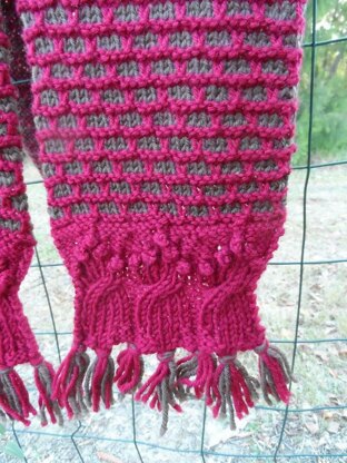 The Pauline Scarf is a warm, woollen scarf in a mosaic stitch. Only one colour is used for each row. There is an elegant edging of bobbles, cables and tassles at each end.