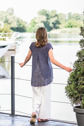 “Pava” top is worked from the bottom up in one piece in the round. At armhole level, work is divided into Front and Back, which are finished separately, shoulder seams are joined using the three-needle bind-off method.