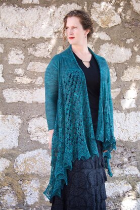 Starting with a provisional cast-on, you work up the left front, shaping the armscye with short rows and using waste yarn to mark the sleeve placement, then work straight across the back and down the long right front, finally returning to your provisional cast-on to add the lace border to the left front. Stitches are then picked up for the sleeves, with short-row shaping of sleeve caps.