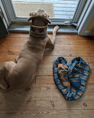 This fun dog’s cowl shows the love for our fur friends. A human infinity scarf in opposite colors will match our four legged companions. The dog’s cowl is adjustable by adding or substracting the 15 sts pattern repeat to fit your favorite dog. A matching hat for the humans complete this paw-some set.