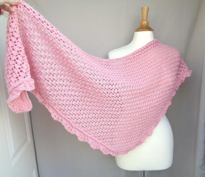 This sweet shawl is worked side to side with a delicate blossom lace, and finished off with a scalloped lace edging.