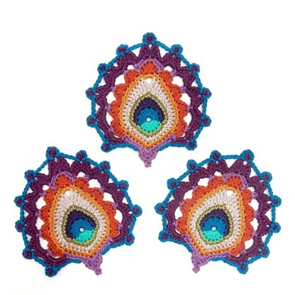This PDF crochet pattern is for a crocheted "Art Nouveau" Peacock Feather motif, which looks fabulous in all kinds of color combinations. I can imagine you might want to use them to make garlands or bookmarks or to decorate box lids, cushions, notebook covers or laptop / tablet sleeves, or use as a coaster to name but a few possibilities. And they make lovely birthday, teacher, holiday or housewarming gifts. Pattern includes: 1. Clear written instructions and an elaborate photo tutorial with no less than 40 photos to guide you through the pattern for the "Art Nouveau" Peacock Feather motif 2. US and UK crochet terms 3. Details on Scheepjes Catona yarn and the colors I used