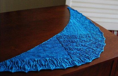 The peacock became an almost universal symbol of the Art Nouveau movement. With its striking colors and flamboyant tail, the peacock was stylized onto everything from jewelry and dresses to vases and book plates. This top-down shawl, with its dramatic curving edges, pays homage to the peacock tail with a center panel of “eyes" and a sweeping border of “feathers".