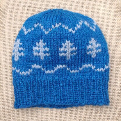 Colourwork patterning on this hat takes you on a journey from the waves at the shore, through the forest to the mountain peaks.