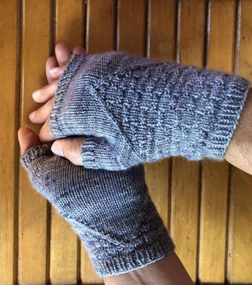 Oh, the ups and downs! If there is one constant in life, it’s that it’s rarely constant – but sometimes you can look at all the changes and see how they connect. In that spirit, these fingerless gloves are designed using simple texture and twists to create a valley on one side of the hand, wrapping around into a peak on the other side.