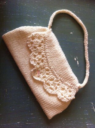 An elegant beaded bag made with Twilleyâs 4ply bamboo, sadly discontinued. This bag is started by knitting the lace beaded flower edge for the flap. Then stitches are picked up along the edge, the flap is shaped with short rows and the remainder of the bag is knit in stocking stitch with purl rows for turning and increases and decreases for shaping before sewing up. Lining is added to give it stability and strength. An icord becomes the handle. A flower petal hole is used as a button hole and a pretty mother of pearl button finishes the little purse.