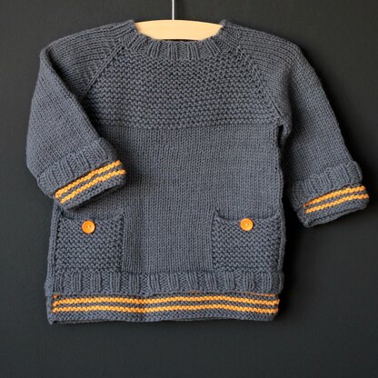 "Peekaboo! I see you!" This classic crew-neck top-down sweater is playful with its faux undershirt peeking out of it. Garter stripes offer customization opportunities while using up yarn leftovers, and cute faux seams add a polished touch. There's even an option to add pockets! Knit seamlessly top-down, with a garter front yoke. Pocket linings require seaming. Sts are picked up for the "undershirt" portion. The 3/4 sleeves are worked in the round. **Skills**: casting on, knitting, purling, increasing, decreasing, knitting in the round, picking up stitches, binding off. If making pockets: yarn over, seaming. **Gauge:** 18 sts x 26 rnds = 4 in/10cm in stockinette st in the rnd w/ lg ndl 18 sts x 40 rnds (i.e. 20 ridges) = 4 in/10cm in garter st in the rnd w/ sm ndl