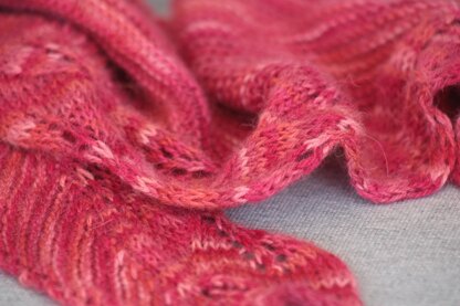 This pretty scarf has a simple leafy lace edge that is reminiscent of the mountains and the trees in the area, and garter stitch for easy knitting in front of the telly or the fire on a cool night.