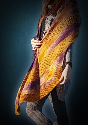 This pattern is designed for using up that gorgeous skein of hand dyed sock yarn which has been waiting in anticipation of the right project. Teamed with six mini skeins, or remnants from other projects, this wrap is the perfect, elegant stash-buster.