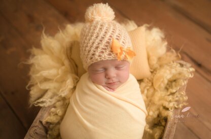 cute little hat, knitted flat and sew in the back, optional with little chiffon bow.Easy project, will make a beautiful gift to a new born .can be worn any time ,even in cold summer evenings.Will fit a baby up to 2 weeks.