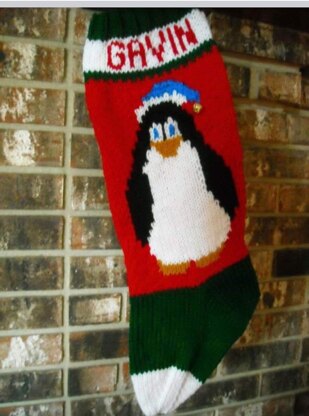 This chubby penguin stocking is appropriate all ages and will be a keepsake for the lucky receiver. Knit with acrylic yarn and angora may be used for the brim of his stocking cap. You may sew on a bell or pom on the tip of his hat.