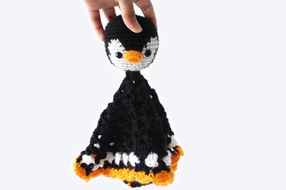 This is a crochet pattern for a penguin lovey blanket, perfect for baby showers and nursery decor! This penguin friend is great to cuddle with and at 12 x12 inches for the blanket, it's a great size for little ones to carry around. This penguin lovey pattern is made all in one piece, with the exception of the nose that's added on at the end. To make sure this is a very secure toy, I wanted the head and the blanket part to be continuous - there's no chance of it coming apart if it's one piece!