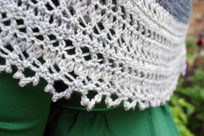 A wide crescent shape of soothing garter stitch is balanced by a beautiful but easy to knit lace border and a striking looped picot bind off. The shawl is fully reversible, as the lace has no right or wrong side.