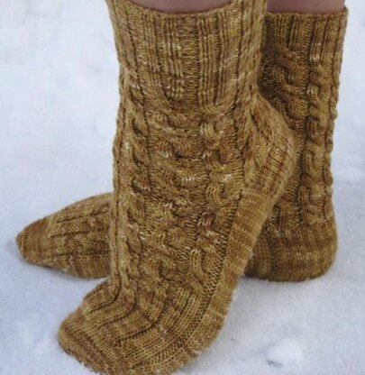These socks feature an elegant cable pattern interacting with basic ribbing in an offset fashion. The socks are worked from the cuff down in fingering weight yarn and are mirror images of each other.