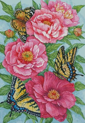 This counted cross stitch pattern of Butterflies on Peonies was created from Artwork copyright of Lorraine Ryan, licensed through Creative Connection, Inc. Only full cross stitches are used in this pattern. It is a black and white symbol pattern. 84 DMC Colours are used. A mini version of this pattern is also available.