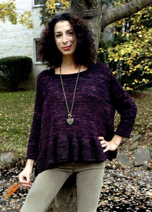 An a-line, oversized, boxy raglan pullover with a deep ruffled hem. The sleeves are fitted to contrast the fullness of the body. The back, front, and sleeves are worked flat and joined in the round at the underarms to work the raglan shaping.