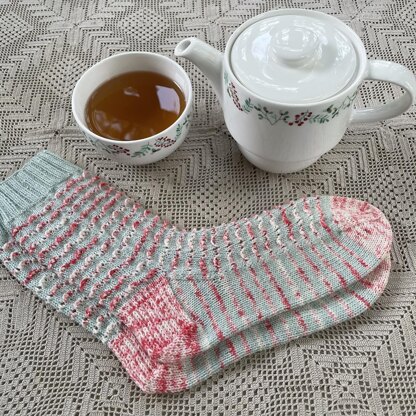 These sweet socks are knit with a two colour Share A Pair set, and have beautiful texture, but are simple to knit! I made them as Christmas socks but they would make fun scalloped socks in any colours! The pattern is easy to memorize once it’s established, and only one round per repeat is patterned.