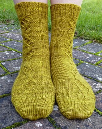 These toe-up socks use an intricate cable pattern on the front, with a wide rib on the back of the leg for a better fit. Much of the work is done with increases and decreases which remove a lot of the bulk of such a large cable. The socks are mirrored, so the pattern provides separate instructions where necessary.