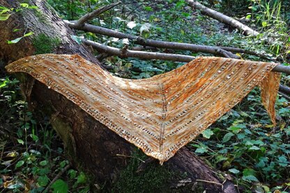 Difficulty level: easy (basic shawl construction, easy lace stitches, beading)
