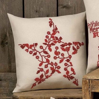 Finished design 40 x 40 cm (15 x 15in) This Scandi cushion features a fabulous berry star design. Your kit includes Ecru Aida 8in Pearl yarn, cotton mat and fabric for backing.
