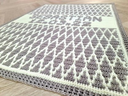 This crochet pattern uses the inset mosaic crochet technique for the main section of the blanket and then bobbles to create the personalisation for the name and date.
