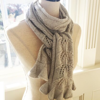This sumptuous, luxurious, feather-light scarf is extravagant and warm! No worry about gauge as after blocking it will be as wide as it needs to be and you can adjust the length to make it short for one wrap, or even longer for several wraps. The unique ruffle at each end makes it feminine and versatile. Choose any DK weight yarn or heavier, but something comfy and soft is nicest next to your skin.