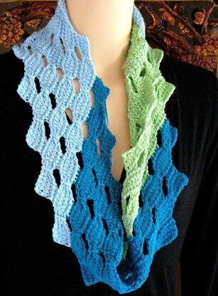 This Tunisian crochet lace pattern pleasantly edges itself as you work each offset group of rows. It is crocheted with no shaping, then seamed into a ring scarf (a.k.a. Snood, Shoulder Cowl Wrap, and Eternity scarf). The seam of the pink fingering weight one is disguised with a few rows of seed beads and turns this easy shape into a special gift, especially if you use cashmere yarn as shown here!