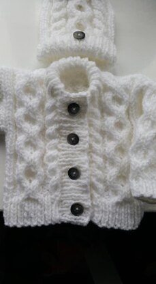 The pattern contains instructions for a Jacket, 2 styles of hat and booties to fit 16″, 18″ and 20″ chest and the end product is larger as it is a jacket, it would easily fit a 2 year old. This is an ideal knit for people new to cables.