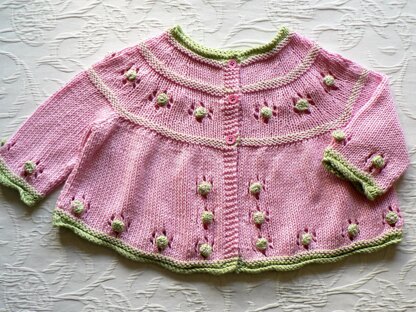 A dainty cardigan for a baby girl, featuring a lacy flower border & contrasting scalloped edging. Worked in Sirdar Snuggly Baby Bamboo DK, the pattern is in PDF format on 6 pages, with instructions in two sizes, to suit ages 0 – 12 months.
