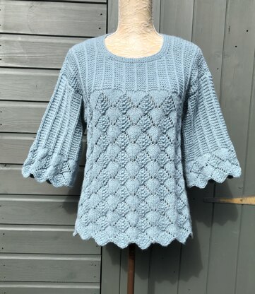 Beautiful eyelet patterning and a scalloped edge makes this sweater stand out stylishly. Wrong-side rows are all purl. The yoke is in purl garter stitch with a single knit stitch forming a rib, and again wrong side rows are all purl. Both the body and sleeve are gently flared making this super easy to wear. Worked bottom up and with full written instructions.