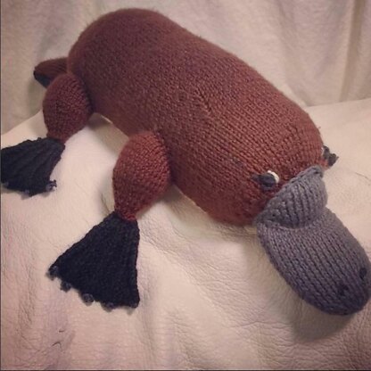 The platypus measures ~21” long when completed. This pattern is worked piece wise and stitched together at the end – no advanced stitches are needed. The eyes and nostrils are embroidered.