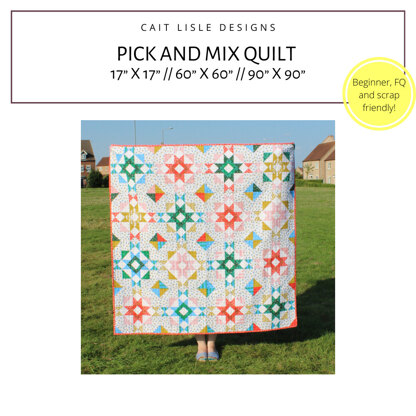 Inspiring you to shop your stash like you would an old-fashioned sweet shop, Pick and Mix is the perfect scrappy quilt. The stars are made from half square triangles, quarter square triangles and squares in squares, making this a beginner friendly pattern that comes together surprisingly quickly. Check out my blog on chain piecing for some speed tips.\n\nPick and Mix comes in three sizes; throw, queen and cushion. Whether you use it to make a expertly coordinated bedroom or living room set, or just make one cushion to show off that gorgeous piece of fabric hiding in your stash, Pick and Mix is a super fun pattern. The unique results produced makes it ideal for any quilter, no matter your style or skill level.\n\nThe downloadable pattern includes:\n\nHelpful tips and diagrams for piecing and assembling your quilt top\nLots of ideas for different colour schemes and colouring pages to help you choose your layout and colours\nFat Quarter and scrap friendly\nSuitable for beginners and beyond\n\nShare your projects with #PickAndMixQuilt and #CaitLisleDesigns!