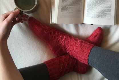 An whimsical diamond cable pattern on the Pierrot socks is evocative of the Harlequin and Pierrot stock characters of commedia theater. Written in three sizes, these socks look great on any foot and will bring a little fun and whimsy to your toes :)