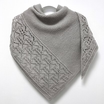 ’Pierside’ is inspired by the natural ripple patterns and air bubbles formed by the movement of the water by the pier. This asymmetrical but nearly triangular shawl complements its decorative panel with the soothing regularity of garter stitch.