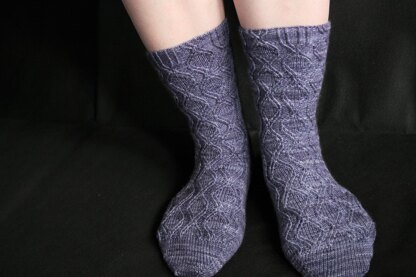 The colour of this yarn combined with the diamond motif reminds me of Amythst, which is a type of quartz. Quartz has the fairly unusual property that when compressed it generates an electrical charge - this is called piezoelectricity. I can't promise that they'll generate electricity, but these socks will put a spring in your step.