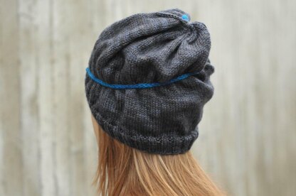 Pilot Light is a ruched slouchy hat that employs an integrated I-cord that moves across the surface of the fabric using cable crossings.