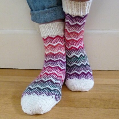 This toe-up sock with a traditional heel flap and gusset, has a fun stranded pattern, with a differently patterned sole and gusset. You could use a gradient yarn as I have done for the sample, or two solids; even a selection of colours for the contrast would work well, the choice is yours!