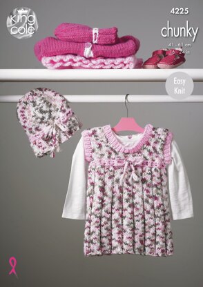 Pinafore Dress, Cardigans & Hat in King Cole Chunky - 4225 - Downloadable PDF is a Intermediate Knitting pattern by King Cole, available as a Downloadable PDF and includes instructions in English. Super fun to make, this pattern could be your next masterpiece!