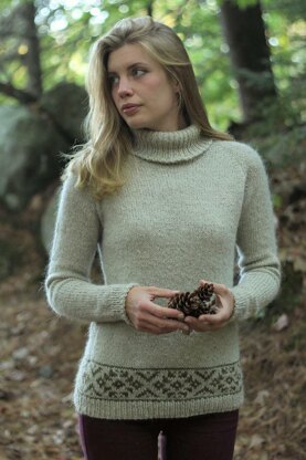 This sweater is ideally cozy & perfect for outdoor explorations as the temperatures drop! Sweater is worked from the top down flat to start and then joined in the round at the front when the neck shaping is completed. Sleeve sts are placed on holders while body is worked. Sleeves and turtleneck are then worked and bound off.