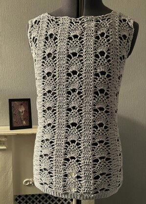 This pattern is for a tank top in the popular pineapple mesh. I keep the design simple, so no half pineapples, and limit the instructions to 6 chest sizes. Any chest size can be made any length. There are also suggestions for changing the style of the shirt to suit your own needs. The garment is made in two pieces and then sewn together. I made the shirt from DK Cotton, specifically Sirdar Cotton DK. This is smooth and easy to work with.