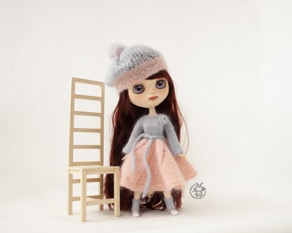 Pattern for knitted outfit includes a description of knitting dress, beret, gaiters