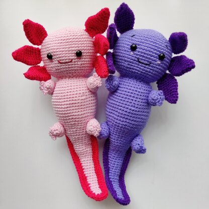 This is a Crochet Pattern to make your very own Axolotl. It is written in UK Crochet terms. The finished product should be around 30cm in length, and there is also a bonus pattern to make a mini axolotl if you have any yarn left.**For this pattern you will need:**3.00mm crochet hook Scissors, Stitch Marker Darning Needle, Pins Polyester Filling 10mm Safety Eyes 6mm Safety Eyes (mini axolotl)**Yarn:**Approx 40g or 120m of Pale Pink DK Approx 15g or 45m of Dark Pink DK