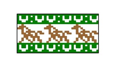 This 12-stitch Pinto stallion chart can be used for small knitting projects like mitts, hats, scarves. It's surrounded by a horseshoe peerie. If you change the peerie colour e.g. to red and blue will get a colourful Fair Isle horse project.