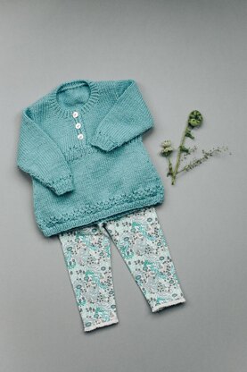 Girls tunic sweater with simple lace and button detailing at neck.