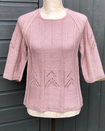 A pretty raglan sweater for all seasons. The background stitch is reverse stocking stitch. Vertical single ribs emerge from the top of the flattering 5 stitch eyelet panels. The backgorund of the panels is worked in garter stitch adding texture to the eyelets. Worked bottom up and with full written instructions.