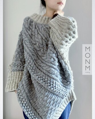 Pisa sweater is inspired by Leaning Tower of Pisa and designed to create a tilted cable world. This oversized garment features overall poncho-like fitting, long-short left & right, bio color reversible front & back, asymmetrical cable pattern and ribbing trims.
