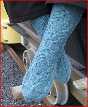 These highly textured socks feature a complex cable panel framed by simple cable columns. They are worked from the top down. The pattern includes charted cable patterns.