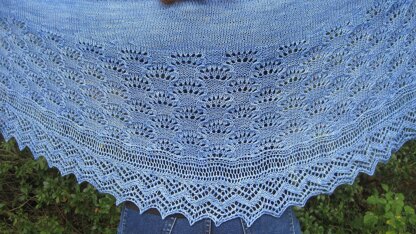 The shawl measures 74 inches at the widest points across the top and is 26 inches deep at the deepest point. It is made with a heavier of the fingering weight yarns, and is knit on size #7 (U.S.) needles. The shawl requires approximately 1100 yards of yarn. The stitches are both charted and written out line by line.